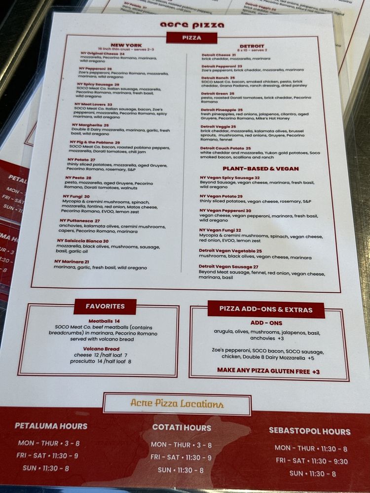 Acre Pizza, located in Petaluma, CA, specializes in vegan, gluten-free pizza. The menu features delicious options like the fungi pizza with a chewy crust, mushrooms, and a hint of lemon peel. Customers rave about the relaxed atmosphere with natural light and arcade games. While some find the prices a bit high for non-pizza items, the quality of the pizza and friendly staff make up for it. With offerings like deep-dish Sicilian style and thin-crust pizza, Acre Pizza caters to various tastes. Game day specials with beer and wine make it a fun spot for gatherings. If you're looking for a unique pizza experience with vegan options and a laid-back ambiance, Acre Pizza is worth a visit.